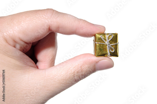 isolated, isolated on white, hand, gift, present, christmas, december, anniversary, celebrate, commemorate, happy birthday, birthday, body, finger, nail, concept, meaning, interpretation, yellow, gold, knot, lace, bow, wrapped, small, smaller, little, fine, tiny, memory, good