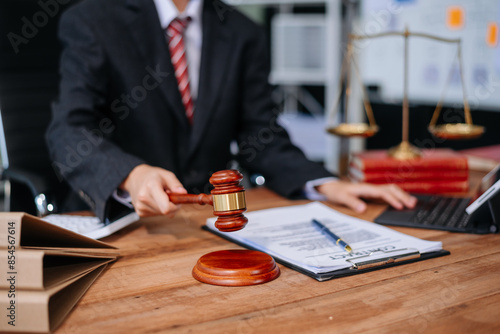 Justice and law concept.Male judge in a courtroom on white table and Counselor