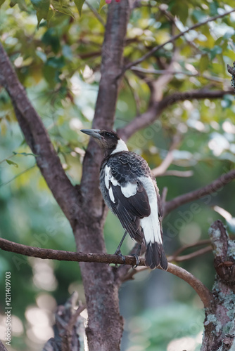 Juvenile Australian magpie (Gymnorhina tibicen) on a branch. Coochiemudlo Island, Queensland, Australia
