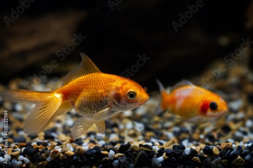 juvenile oranda goldfish, commercial aqua trade breed of wild Carassius auratus carp, cute comet-like long tail ornamental fish swim lazy in low light nature design tank