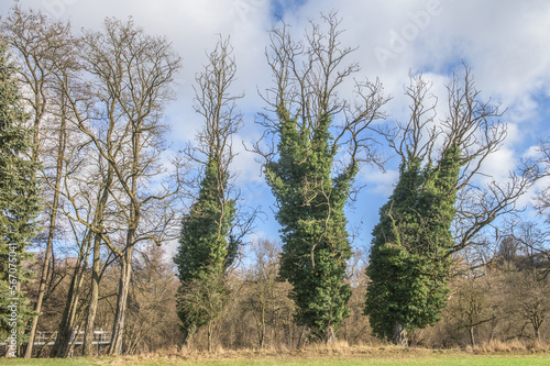 Kahle Bäume mit Efeubewuchs vor blauem Wolkenhimmel