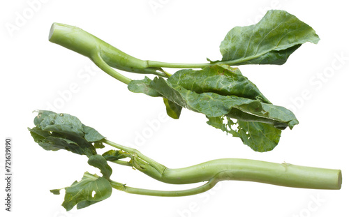 Kale fly in mid air, green fresh vegetable chinese kale falling. Organic fresh vegetable with eaten leaf of chinese kale, heap close up texture. White background isolated freeze motion