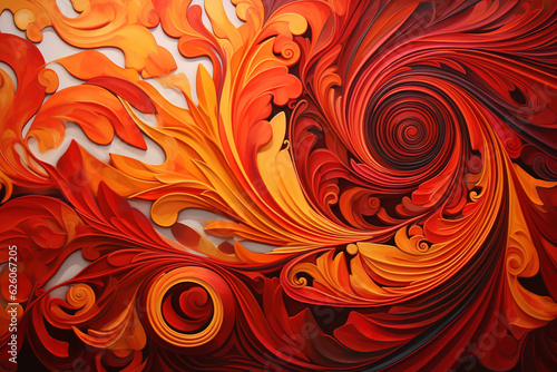 Kaleidoscopic pattern in Bohemian style, swirling and vibrant forms, deep rich hues of reds and oranges, acrylic paint on canvas