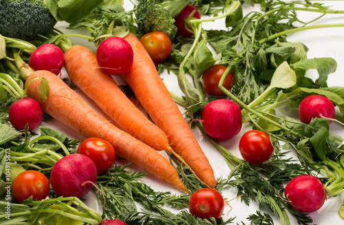 Karotten, Radieschen, Tomaten und Brokkoli mit Blattgrün