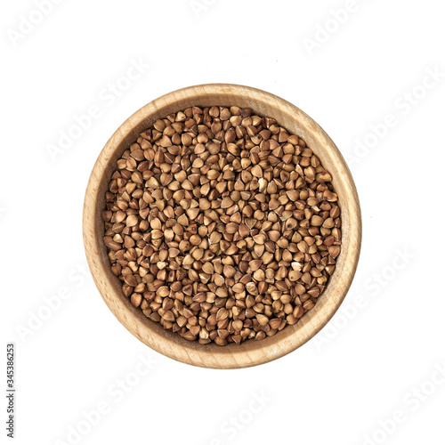 Kasza gryczana w małej miseczce z drewna na białym tle