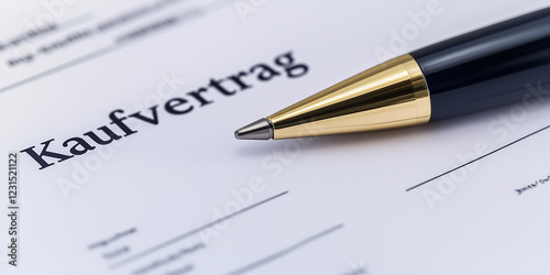 Kaufvertrag der zur Unterschrift ist. Kugelschreiber liegt auf dem Tisch. Vertrag - Kaufen - Unterschrift