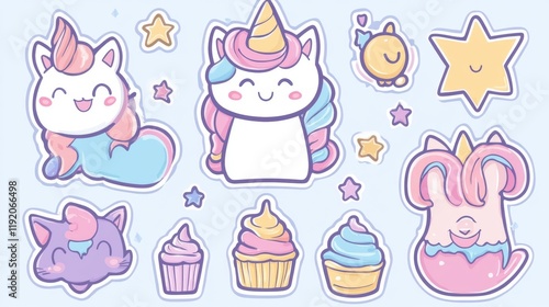fantasy, creature, sweet, treat, sticker, pack, mythical, unicorn, many-coloured, hair, magical, cat, horn, pastel, rainbow, tail, smiling, celestial, element, including, moon, star, cheerful, dessert, face, adorable, crown, emblem, gentle, colours, palette, art, style, smooth, vector, illustration, dimensional, appearance