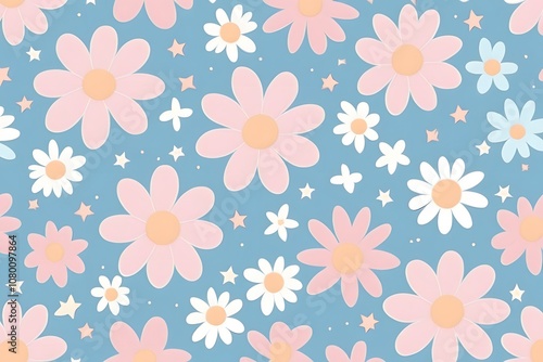 Kawaii flower pattern with cute daisies hearts and stars in soft pastel pinks and blues, AI Generated