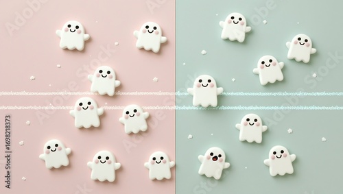 kawaii pastel dashed divider line with tiny smiling ghosts floating above