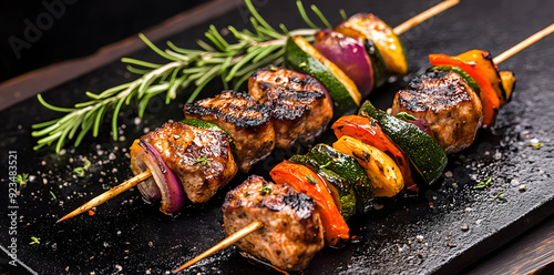 Kebab grilled meat and vegetables on skewers commercial advertising photo