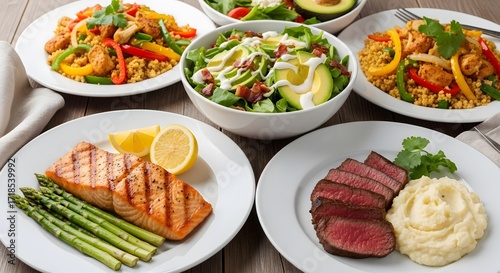 Keto meals a selection of healthy dishes including grilled salmon, sliced steak, mashed potatoes, and a fresh salad, presented elegantly on plates