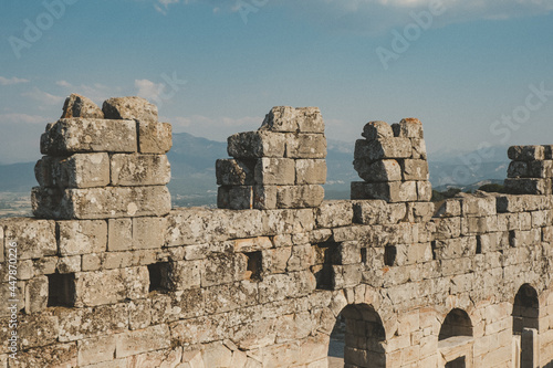 Kibyra Ancient City in Turkey. Walls and stones in the ancient city. Big buildings in the ancient city. Worked stones and columns. City of gladiators. Selective focus.