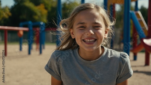 kid caucasian female in gray shirt on playground model portrait giggling for ad concept space for text