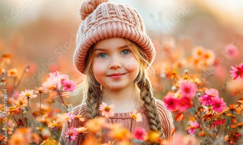 Kid girl with pink knit shirt and beanie hat around with flower garden