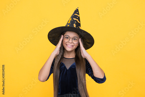 kid goes to wizard school. witchcraft and enchantment. childhood autumn holiday. girl ready to celebrate. costume party fun. happy halloween. smiling child in witch hat and glasses