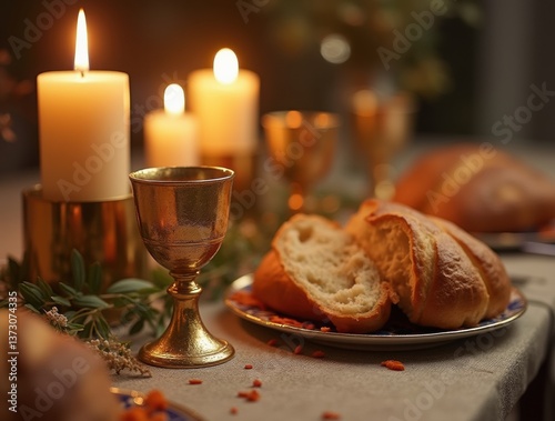 cup, sabbat, table, attractively, arranged, surrounded, challah, candle, joy, jewish, family, gathering, closeup, ritual, spirituality, faith, tradition, culture, heritage, festive, meal, prayer, custom, divine, wine glass, religious, symbol, celebration, closeup