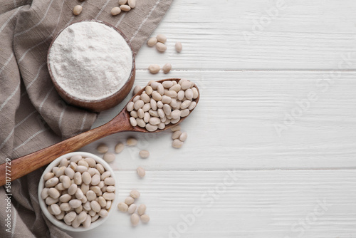 Kidney bean flour and seeds on white wooden table, flat lay. Space for text
