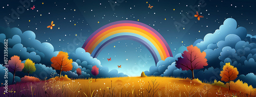 Kids background with blue sky filled with clouds and colorful rainbow, a plain grass field and butterflies around