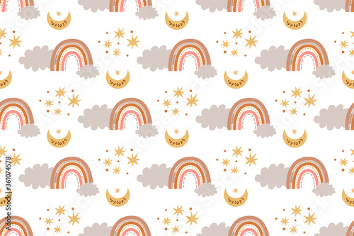 Kids boho rainbow pattern modern pastel rainbows moon clouds Baby boho background Vector