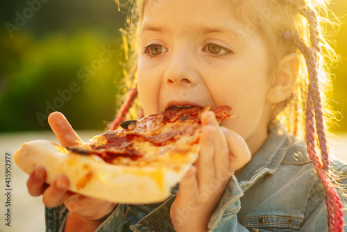 Kids favorite food. Tasty pizza. Child eating pizza. Fastfood. Italian junkfood. Little girl lunch outdoor.