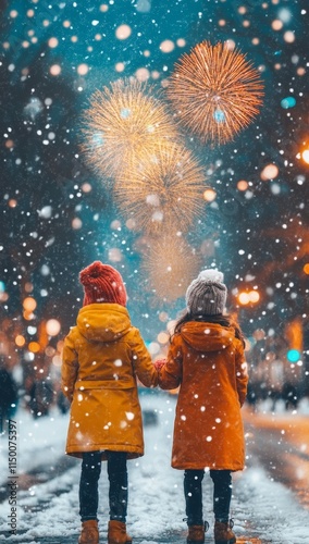 Kids marvel at a winter fireworks show, capturing the essence of the holiday season. Perfect for a festive poster, banner, greeting card, invitation, or postcard.