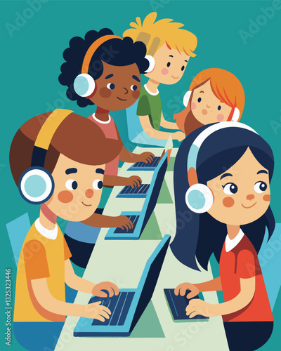 Kids sit at a long table laptops out and headphones on avidly typing away as they take part in a 24hour coding camp challenge.. Vector illustration