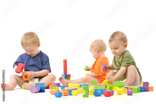 children, children, boy, baby, baby, diaper, colourful, play, module, building blocks, together, t-shirt, orange, blue, green, yellow, red, studio, background, white, kindergarten, creche, build, learn, common, action, active, flair, children, son, grandson, family, group, sibling, brother, man, person, three, cute, funny, male, healthy, energy