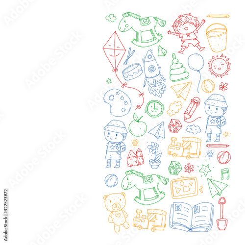 Kindergarten with toys. Pattern for children. Little preschool kids education. Drawing, learning, play