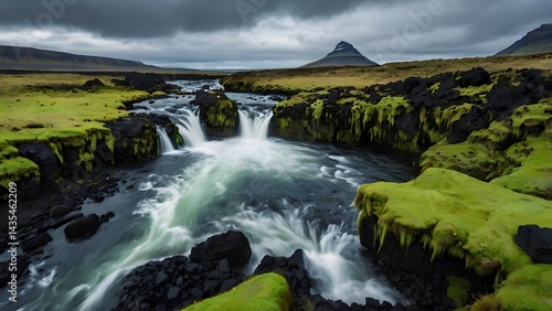 iceland, waterfall, landscape, nature, travel, scenic, nordic, scandinavian, mountain, river, water, stream, moss, rock, basalt, green, cloudy, sky, overcast, dramatic, wilderness, outdoors, adventure, tour tourism, europa, european, destination, photo, long exposure, calmness, peaceful, serene, unspoiled, untouched, remote, isolated, natural beauty, environment, conservation, ecosystem, geology, geologic, volcanic, autumn, autumn landscape, fall