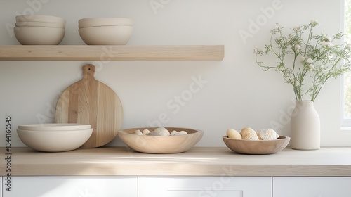 kitchen, countertop, wooden, shelf, white, bowl, cutting, board, vase, flower, wood, cabinet, background, plain, wall, window, aesthetic, minimalistic, minimalism, design