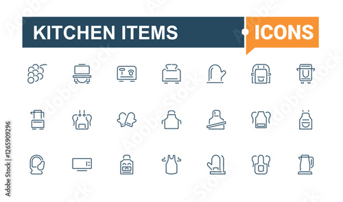 Kitchen Items icon set. Featuring tools, kitchen, plate, graphic, equipment, cooking and more. Thin outline icons pack. Vector icons editable stroke.