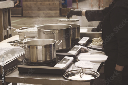 kitchen, eatery, cooking, pan, food, cook, stove, uniform, work, sauce, dish, oven, profession, spoon, tied-up, stirring, pot, counter, hat, preparing, salad, vegetable, shopping, people, hand, training, 2, steel, stainless steel, cook, sauce, utensil, woman, service, street, dumpling