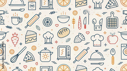 Kitchen pattern cooking icons seamless design culinary tools bakery symbols line art utensil chef hat bread oven playful vibe with cozy feel, perfect for food lovers and menu backgrounds