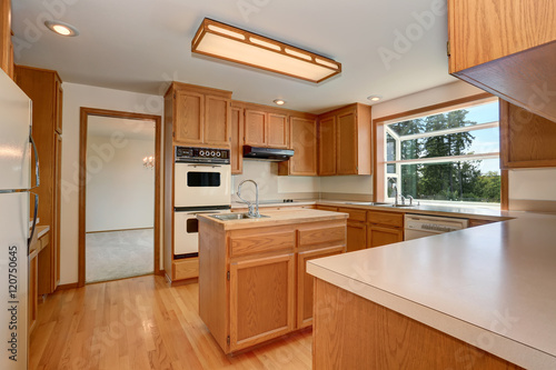 Kitchen room interior with wooden cabinets and hardwood floor.