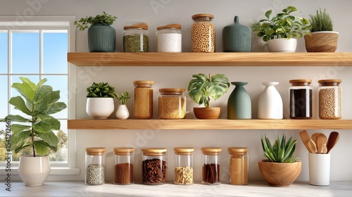 Kitchen shelves with jars of grains, houseplants, and natural wood decor elements