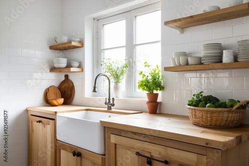 sink, kitchen, cabinet, wooden, shelf, countertop, white, ceramic, tile, window, faucet, plant, greenery, basil, light, farmhouse, rustic, minimalist, modern, natural, wood, drawer, handle, basket, fruit, green, lime, avocado, decor, design, home, interior, style, clean, bright