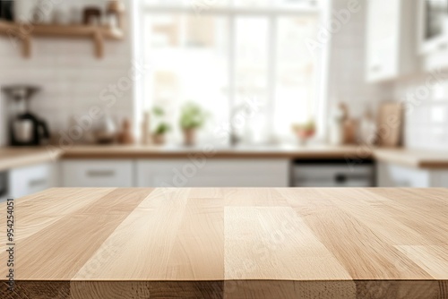 kitchen table background, wood counter top on blur of white clean abstract home interior with bokeh. used for display or montage your wooden for dining background. table banner, ai