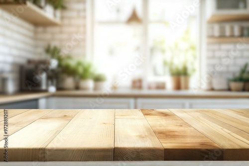 Kitchen wood table top for product display with photo blurred modern interior. Wooden tabletop over defocused kitchen background. kitchen furniture and desk space. product promotion in the kitchen