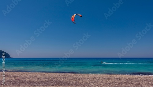 kite, boarding, sport, recreation, wind, power, person, sea, ocean, wave, water, beach, coast, shore, view, scenery, landscape, blue, sky, background, sunny, bright, concept, summer, vacation, holiday