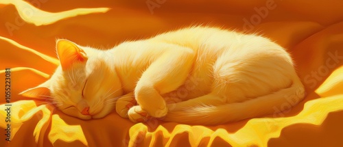 Kitten curled up on a soft blanket, peacefully napping in a sunbeam