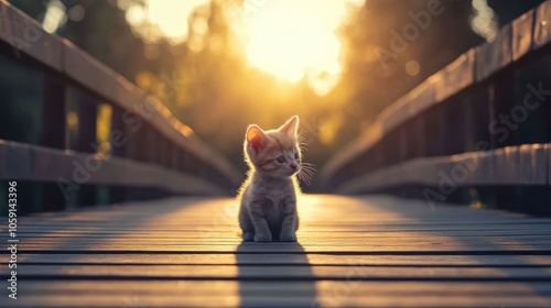 kitten, cat, sunset, bridge, wooden bridge, animal, pet, domestic cat, felino, nature, golden hour, evening, light, shadow, wood, walk, wildlife, cute, adorable, furry, fluffy, playful