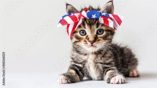 kitten, cat, animal, pet, felino, adorable, cute, playful, fluffy, curious, american, flag, patriotic, 4th july, us, us, celebration, holiday, summer, national holiday, decoration, costume, accessory, bandana, foulard, portrait, photo, image, domestic cat, tabby, whisker, blue eye, green eye, brown, studio, happy, indoor, america, celebrate, democracy, freedom, hat