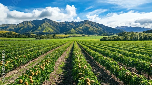 Kiwi fruit orchard in New Zealand, organized rows with ripe kiwi fruits, vibrant and lush setup.