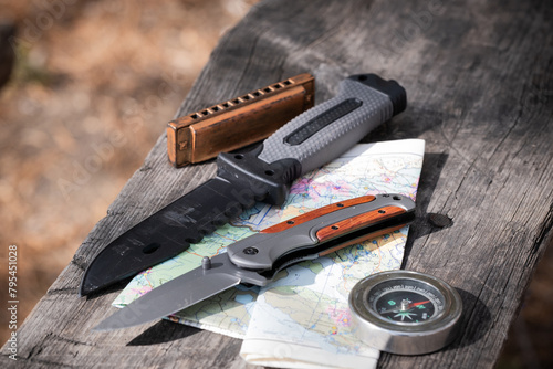 knife, compass, map, wooden table, adventure, exploration, journey, navigation, discovery, outdoors, wilderness, tool, equipment, wanderlust, expedition, rugged, nature, camping, hiking