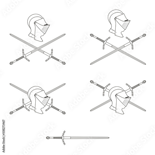 Knight's coat of arms, set - image for logotype. Metal helmet and crossed swords. Design element, icon.