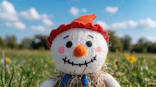 scarecrow, knit up, autumn, field, sunny, day, postcard, halloween, fall, harvest, nature, grass, toy, cute, happy, smile, hand-made, decoration, background, summer, cheerful, whimsical, bright, landscape, meadow, adorable, funny, country, rustic, farm, season, image, photo, picture, design, element, illustration, texture, detail, art, craft, concept, object