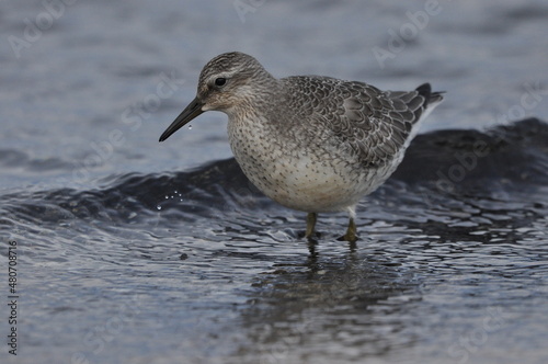 Knot feeding on the sea coast. A young, gray bird gains food during its autumn migration to wintering grounds by the Atlantic Ocean.