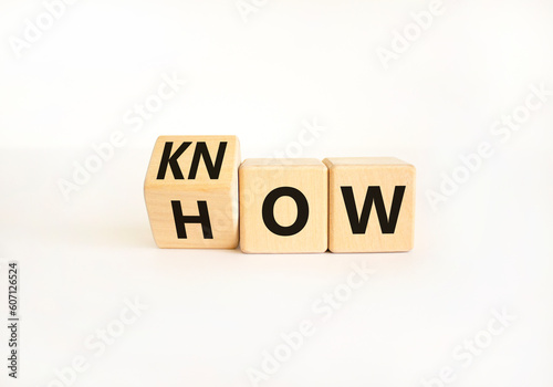 Know how symbol. Businessman turns wooden cubes and changes the word How to Know. Beautiful white table white background. Copy space. Business and know how concept.
