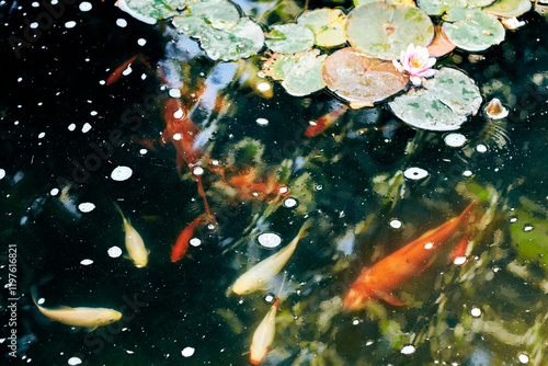 Koi fish swimming in a serene pond with floating reflections