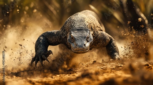 Komodo Dragon in mid-motion, hunting prey in the wild
